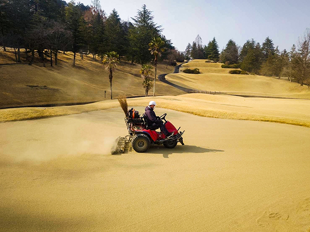 ゴルフコース全般のメンテナンスを担うのが、コース管理の仕事です。18ホールを常に安定して美しく保つために、コースを構成する芝を育成し、刈り込んで適切な状態に保っています。バンカーや土壌の管理、植木の剪定、ティーマークの点検、カップの位置を毎日切り替えるのも、コース管理の仕事です。芝の状態は、見た目はもちろんボールの転がり方にも影響するので、お客さまの満足度に直結します。コース管理のスタッフ一人ひとりが、日々ベストな環境でプレーしていただけるよう、当ゴルフ倶楽部のコース管理では、ボールのスムーズな転がりを追求し、芝一本一本に、真心を込めて管理に取り組んでいます。