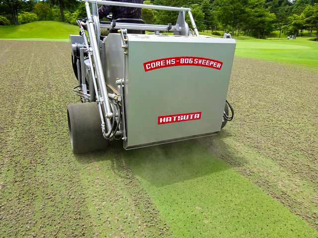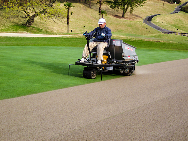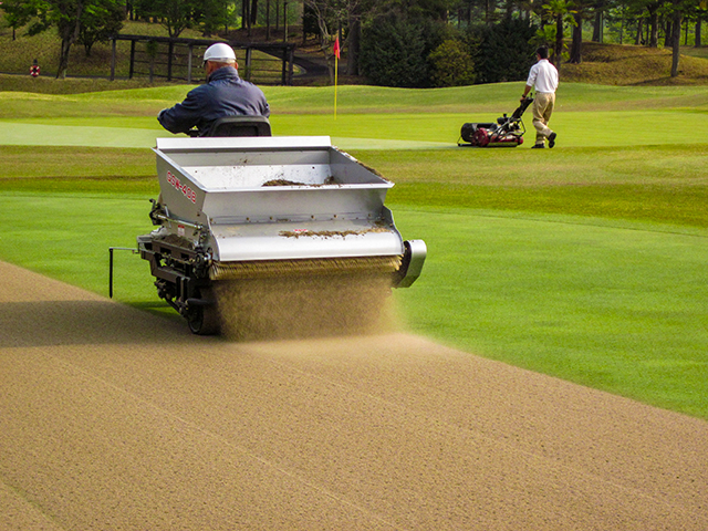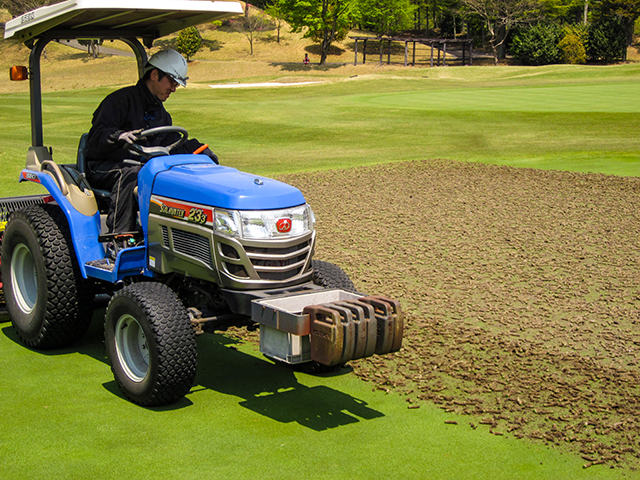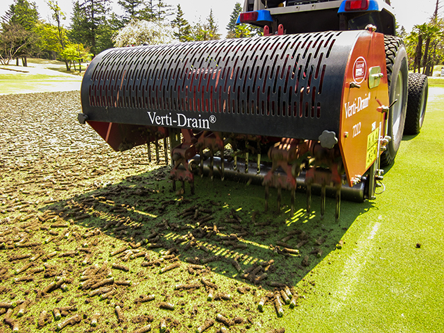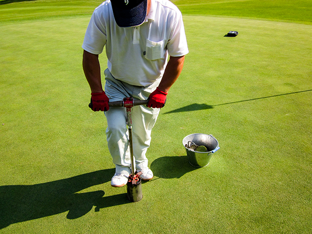 グリーンは主に春と秋の2回、タインと呼ばれる筒状の棒を刺して穴をあけます。その後抜き取った土壌(コア)を回収し、目砂をして養生します。使用開始までの期間、ご迷惑をお掛けしますが、コンディション維持には欠かせない作業の為、ご理解ご協力の程お願い致します。