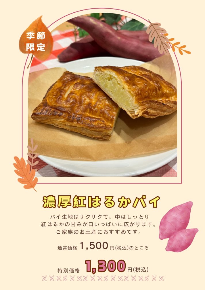 「濃厚紅はるかパイ」通常1,500円(税込)のところ特別価格1,300円(税込)です。