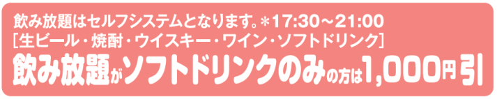 | 料金 | お一人様 5,500円(税込)料理6品~ *ソフトドリンク飲み放題の方は1,000円引き |